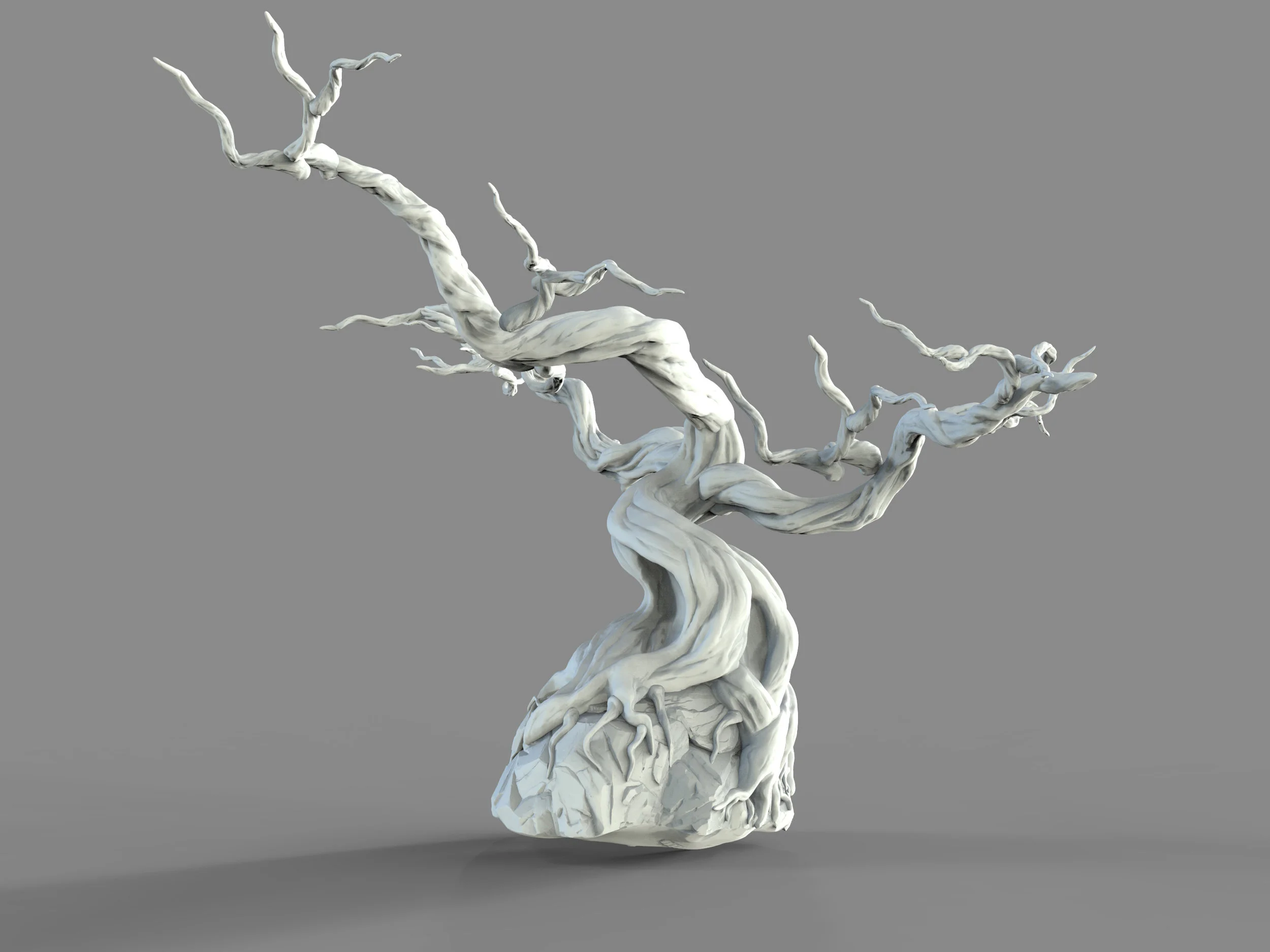 The tree was a hard bone to crack. I had to change the one given by the concept, that was just a beautiful but weak bonsai tree growing on a rock, to something that was meaningful, a reason to build a station there. Because it was a very unique the tree I had in mind, SpeedTree was discarded as an option. So I did the main trunk and huge branches in Zbrush, and the Rock.
