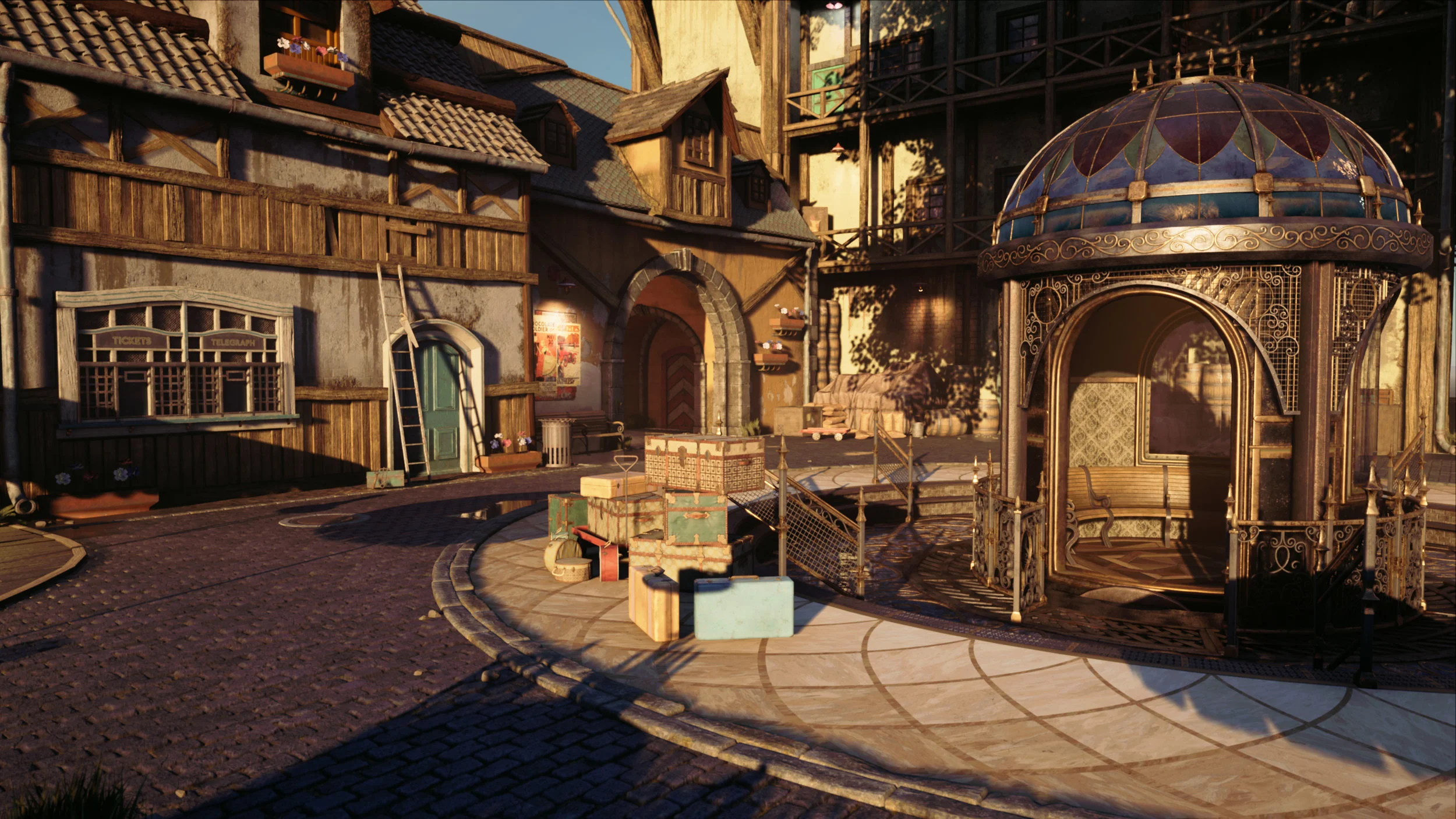 The biggest challenge on this scene without a doubt was building up all the hidden areas of the concept. Because I cannot see it I had to figure out to design those areas. Sometimes perspective of 2D concepts can mislead you, that’s why it’s that important to blockout the big shapes first. I didn’t want to create another fountain in the middle of a plaza and because it was a fantasy scene, I decided to run wild and place a bathysphere-elevator, inspired by Bioshock. For the surface materials, I was inspired by Dishonored, even if the concept had a Studio Ghibli style to it.