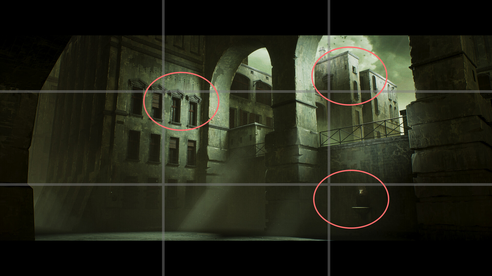 Also, use the different elements to frame the image; we see that I have several that are emerging, a general one in yellow, and one in blue, created by the structure of the building. Then obviously, my arches that draw the eye to parts of the scene I specifically have to work on, add a small lamp there, move my sky to have more interesting clouds, etc.