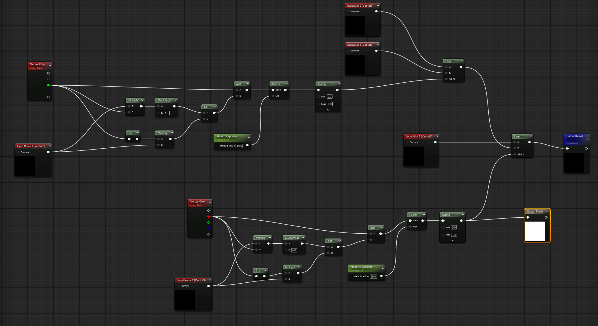 Now let's get down to business. Before even diving into the details of a material, don't hesitate to create some Material Functions. This will make it easier for you to understand your graphs. I used several of them myself but I could have done more, especially for texture management but that will be part of a future optimization of my material. To show you the essentials, here's the one that allows me to have control over the vertex paint masks. The maths taking place before the "mask 1 exponent" would be hard to explain because it's a solution I found in a UE Forums' post. What I can tell you is that this allowed me to blend my world noises with vertex paint and give them more punch.