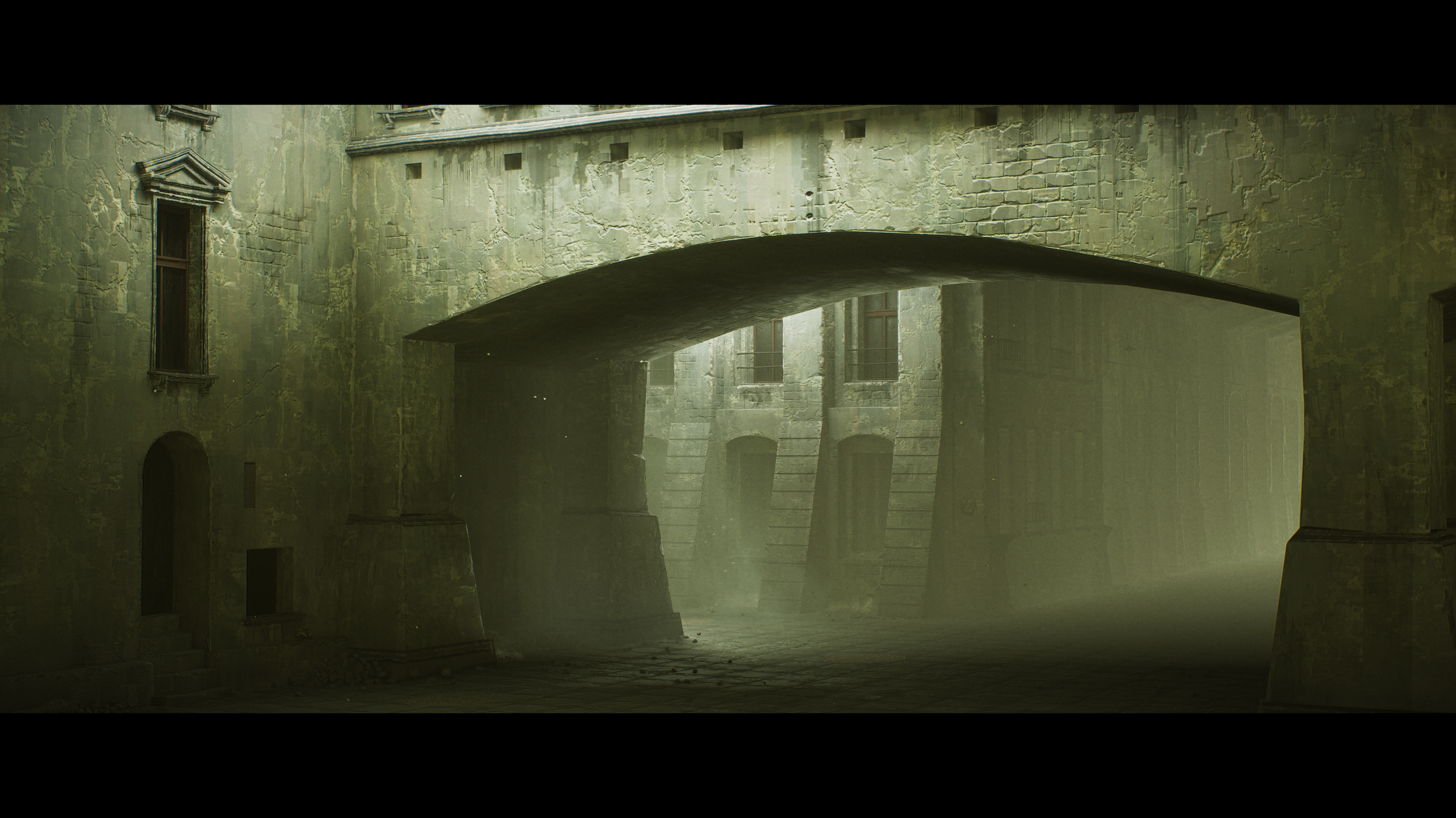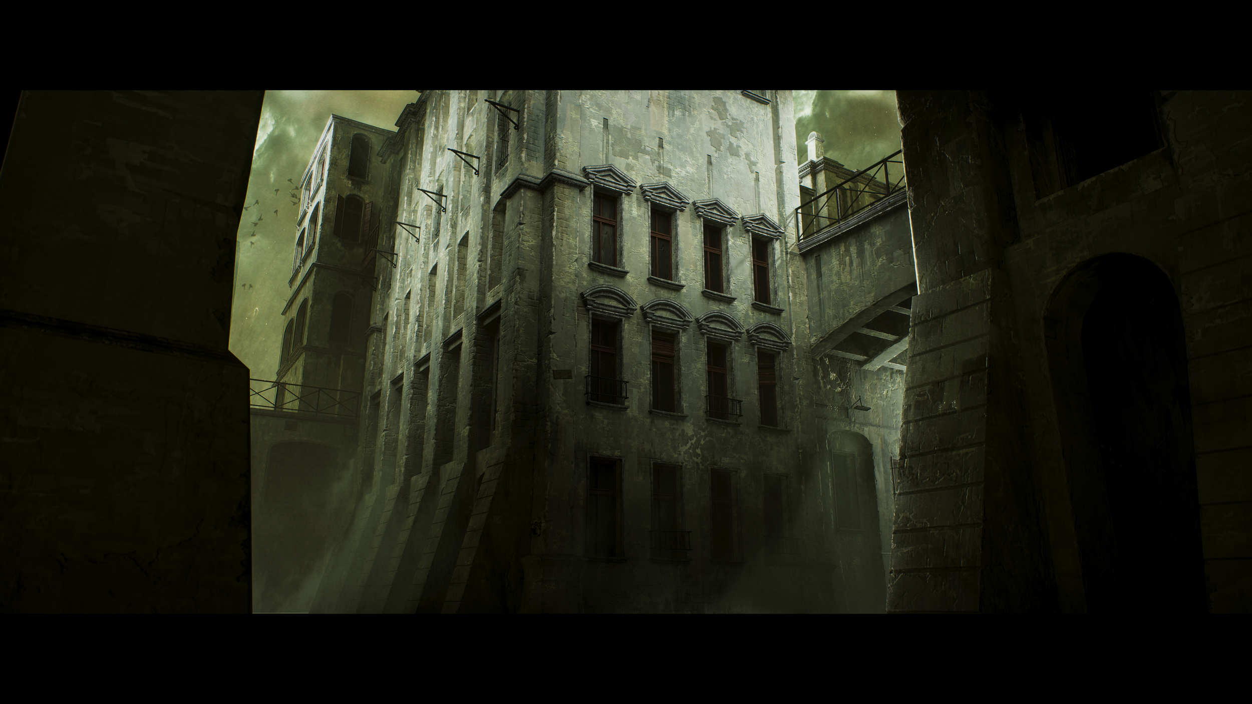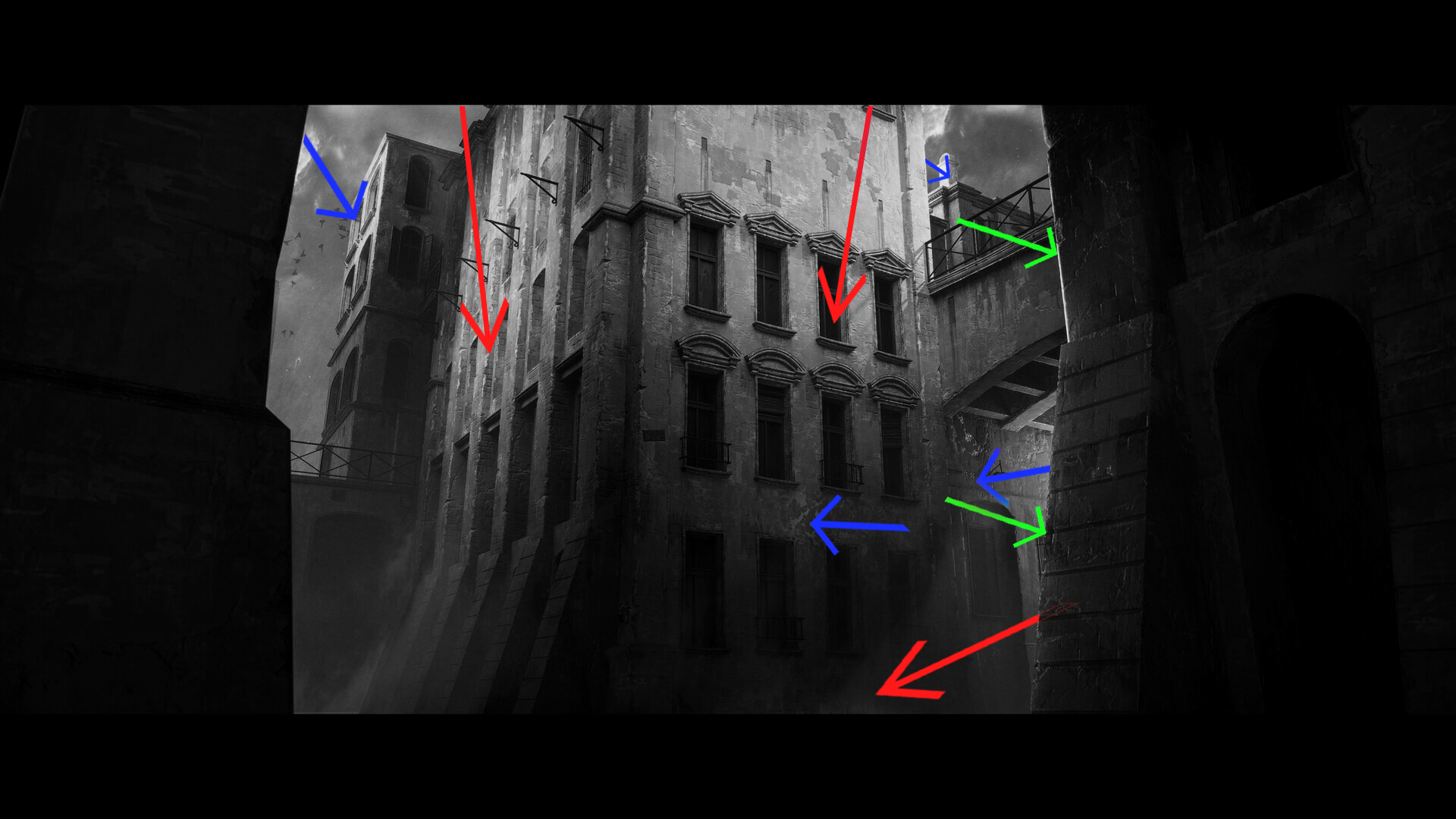 One of the first guidelines was a gradient on the buildings, which we can see especially in the grey picture but I wanted the base of my lighting to accentuate the height. This really is soaking us in this heavy atmosphere as we travel through those areas.