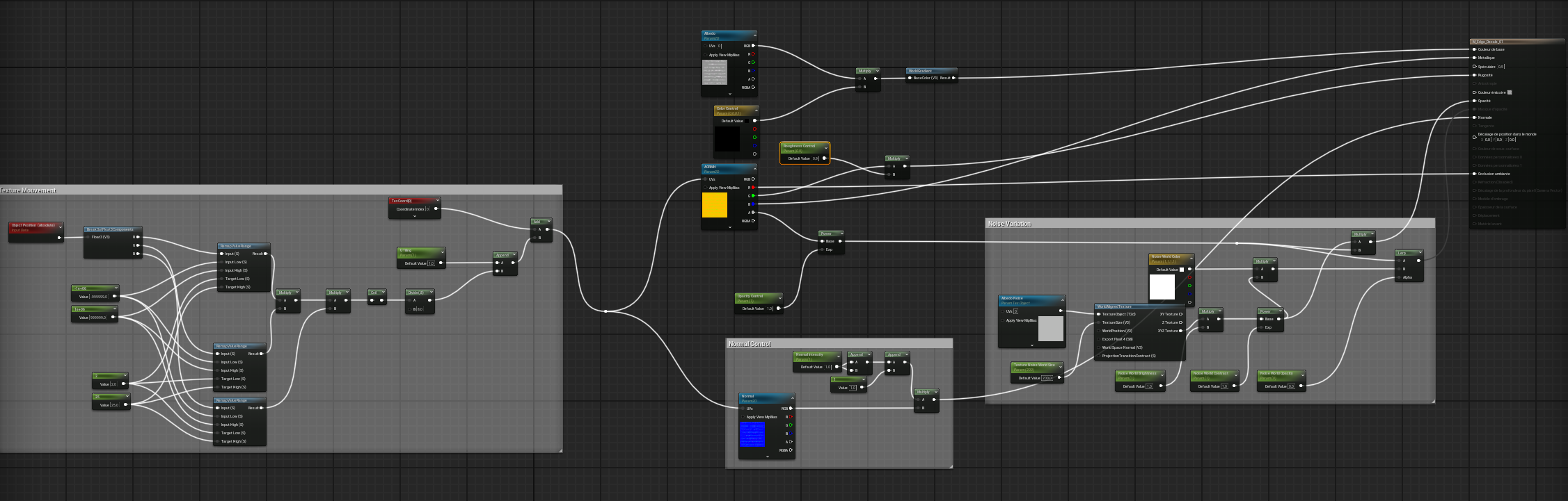 So here we have the part that will manage those step-by-step movements. I’ll admit that my solution is probably not optimal. One of my main difficulties here was dealing with an offset that was created on the texture. The solution lies in the remap. The further I went into the world, the less precise I was about how my texture was shifting, so I decided to work with very small numbers. To manage the number of steps, which can vary depending on the texture in question, simply change the number in B in the Divide node.