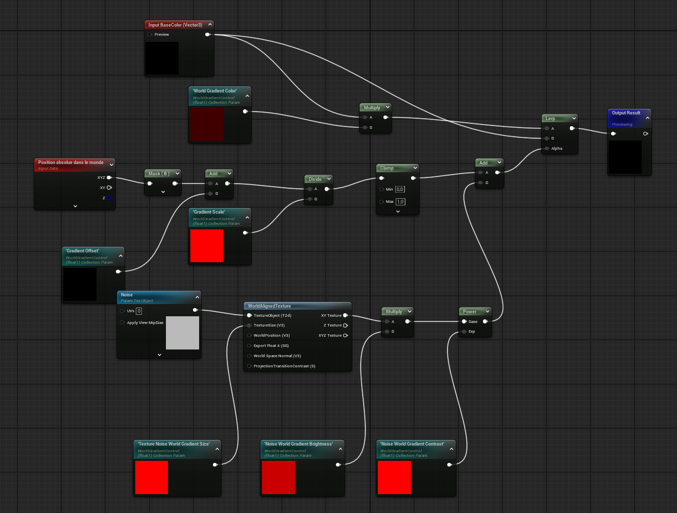 This is a very classic gradient, however the control of it goes through a MaterialParameterCollection. I had never used these before but it's actually quite simple. After creating some scalar parameters in the collection, we can reference them in our material, which saved me from going back to 15 individual materials for each modification. Since I reuse my gradients function in different materials, I have control over all of them directly inside the collection.