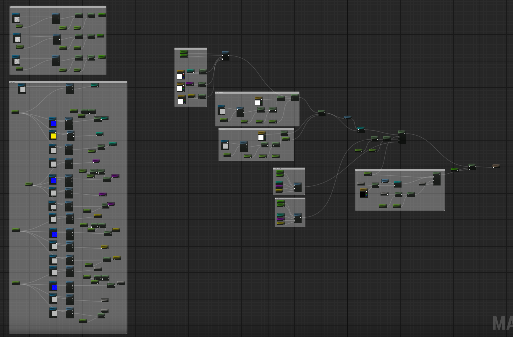 Of course, I made sure to add my worlds gradient material function to my colours. Then, since I used my 3rd noise globally to blend mat 4, I have to go through a MaterialAttributes node.