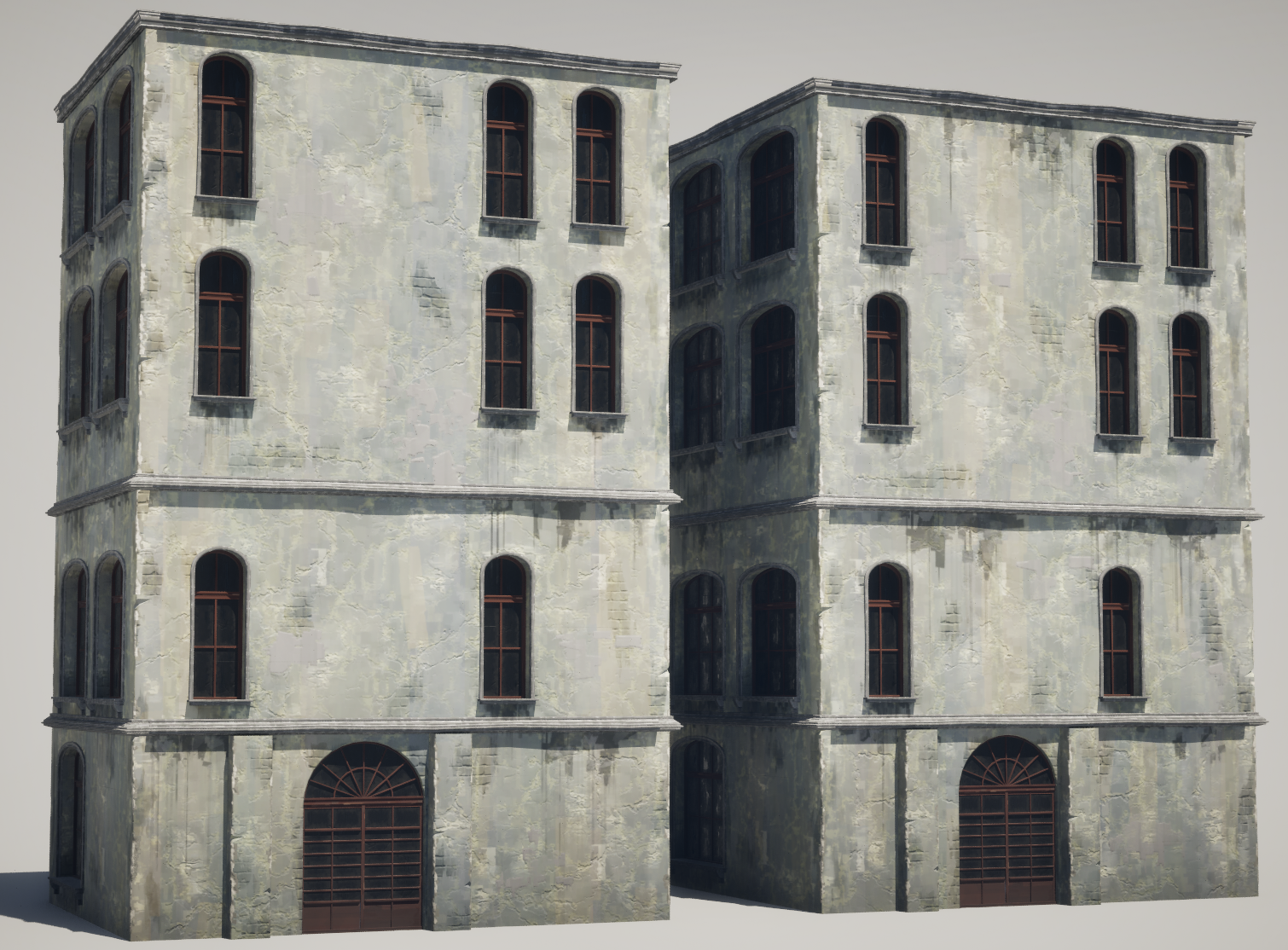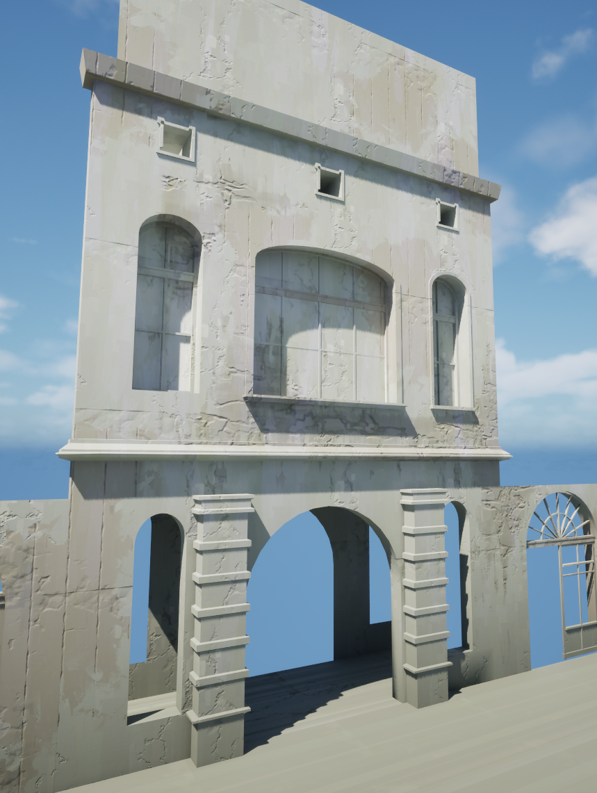 Also, I especially wanted to create similar shapes, for unity and the almost oddly too similar appearance of the scene. While adding these small variations, I spared myself from the visual boredom I talked about previously. A window top and a rounded side help a lot with that. And the final goal was to create something tall! I wanted people to be a little overwhelmed by the architecture, to not always see the tops of buildings, and for that the simple shapes of the pillars helped me a lot. They hide small flaws but also direct the eye quite easily.