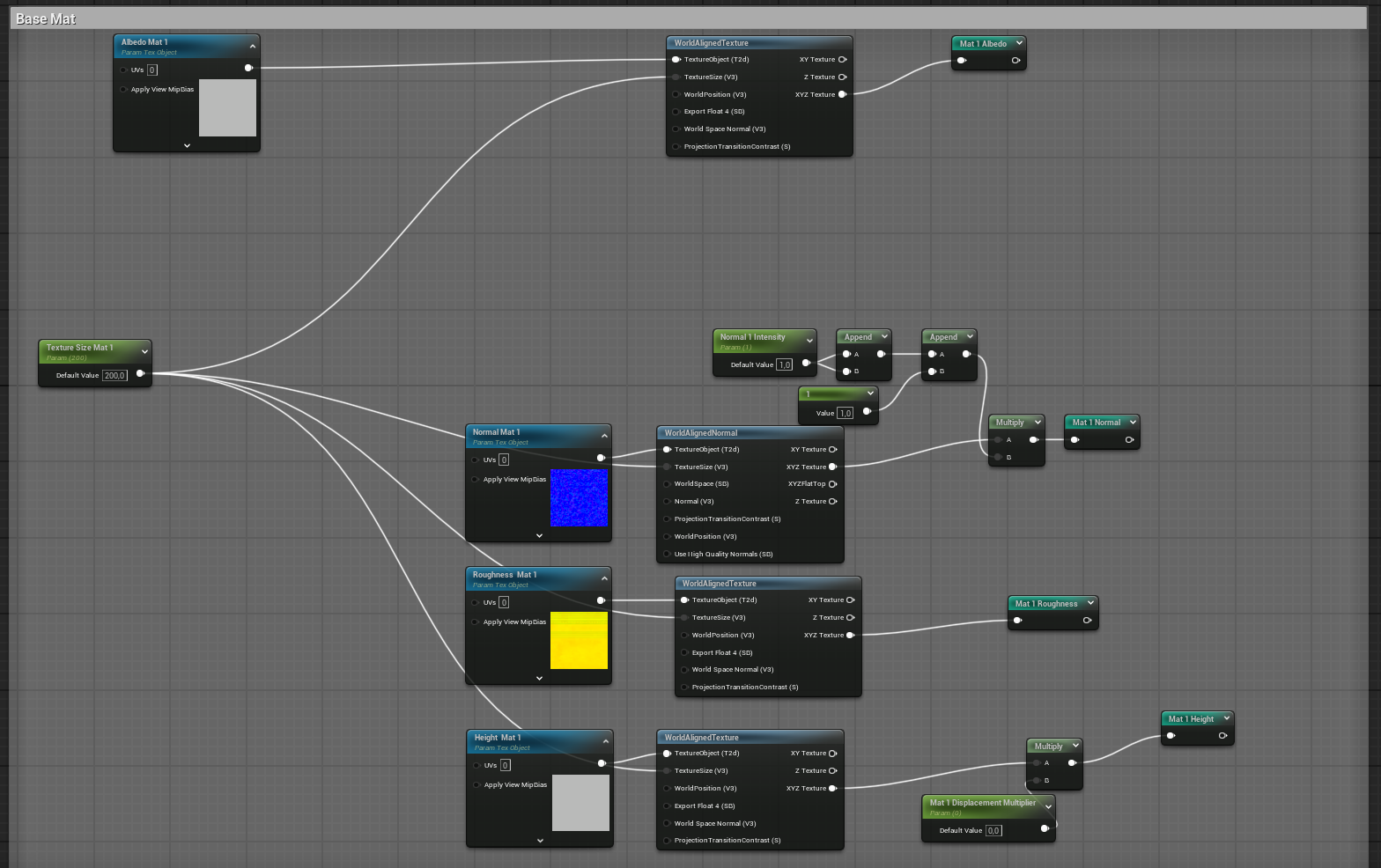 I'd like to warn you that I'm not an expert myself when it comes to materials. Most of my solutions are the products of YouTube videos (our best friend for finding resources) that allowed me to create a material adapted to my needs. With that said, I can already tell you what you won't find in my material: Any blending using Height, the reason being that I have textures that have little or no Height so I didn't see the point. Any tessellation. I tested it and hated it. The result was too grungy for my taste and created interpenetration issues that I decided to avoid by removing all of that.