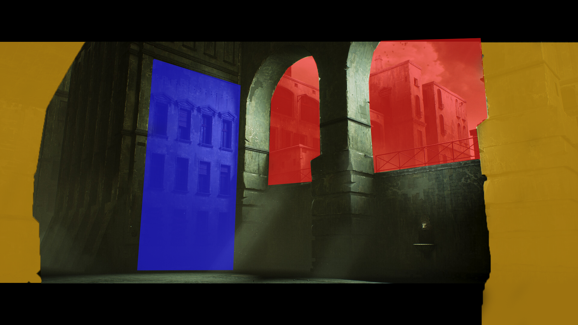 To summarize the exact use of the lamps, I have three main lamps in red, spotlights specifically, which I used to create my main gradients and for the ground (which we see mostly in the video). Then I have secondary lamps in blue, which I used to highlight different parts of the image or to enhance certain areas that were too dark, mostly the two at the bottom of the picture. Then the green ones, which are purely to increase the edge highlights, so the back and foregrounds stand out more. The perks of working one shot at a time in my case, were that I could keep this very painterly approach where I could detail each element of the visual without worrying about whether a player would see the deception or not; I was having fun and doing what pleased my eye.