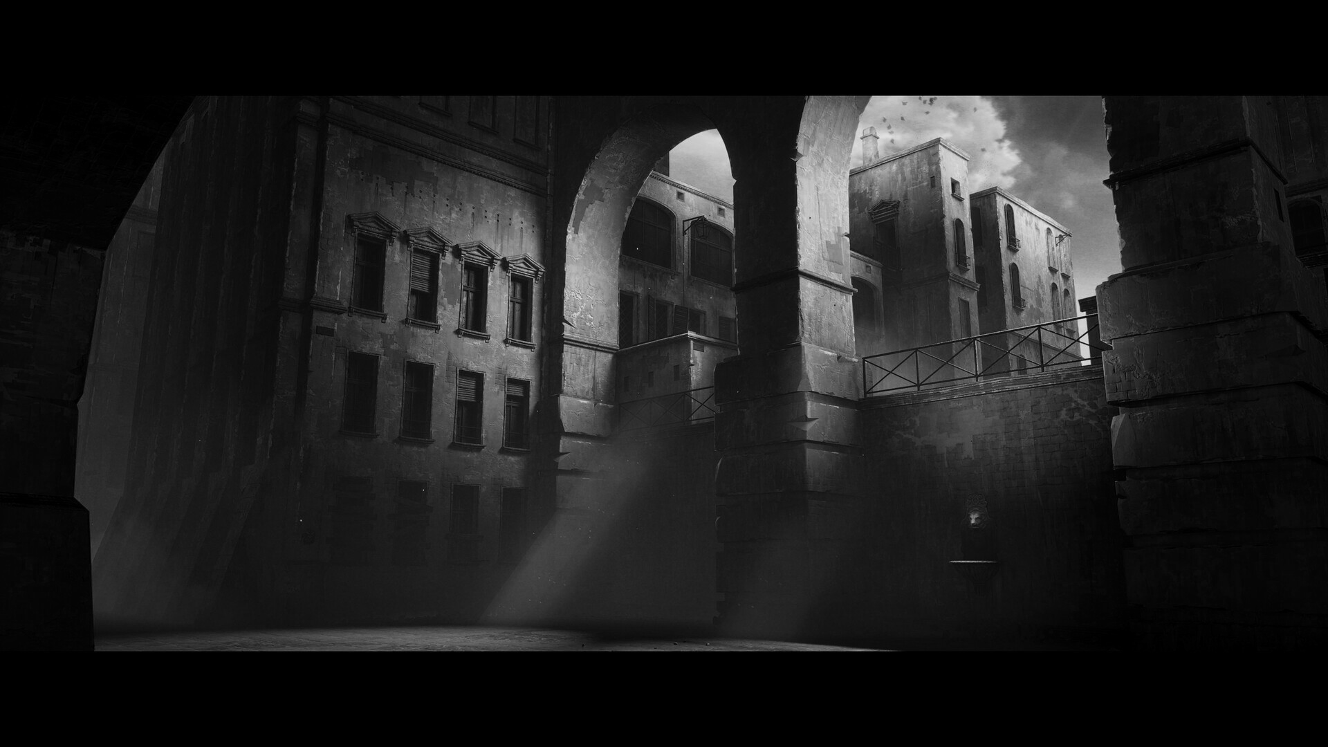 Following that, light also plays a key role in guiding the eye and making the different planes stand out. In black and white we immediately see the upper right section pop from the rest.